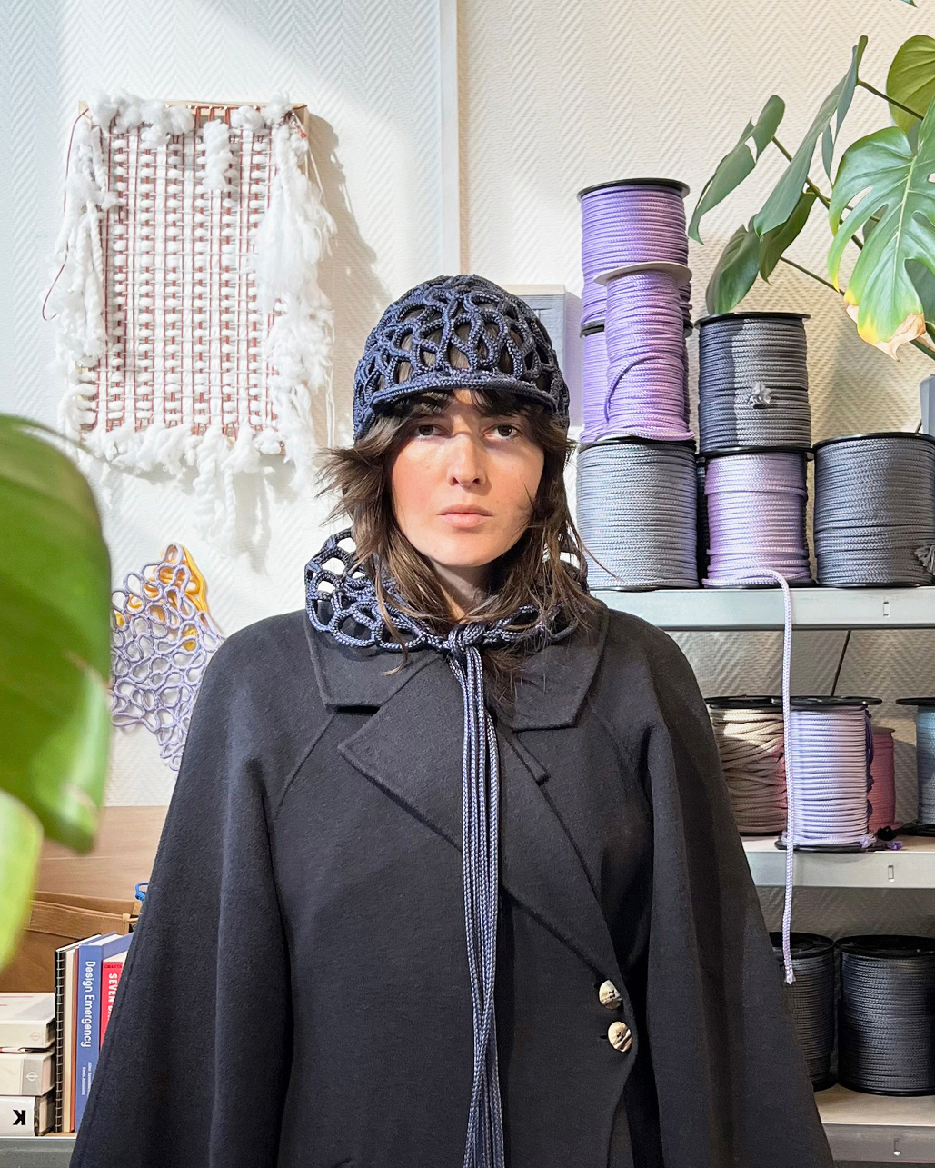 Simultaneously, she delves into the design sector’s imperative to create slow and meaningful spaces and encounters. Her dominant design tool is weaving, and she has developed a technique inspired by net-splicing methods used by women in fishing communities—emphasizing care, patience, and often invisible labor. Without set patterns, each piece evolves intuitively, escaping the binary code of loom-based weaving, and turning the process into a slow, meditative dialogue between chance and intention.