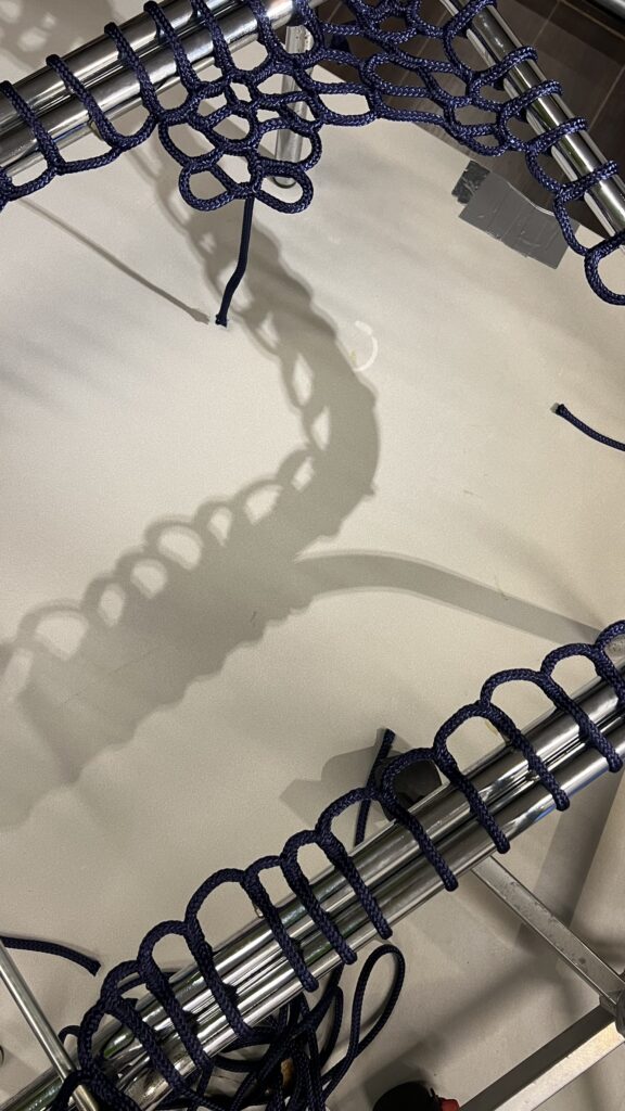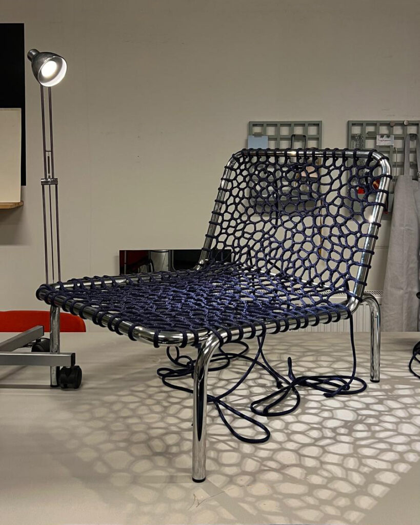 The Take a Seat collection is a part of the Liftovers project — an upcycling trajectory of my design practice. The collection consists of second-hand chrome tubular frames, iconic of the mid-century modern and space-age eras, restored and transformed with my hand-woven rope nets. Using an intuitive weaving process without predetermined patterns, the nets embody a dialogue between chance and order, blending chaos and structure. Weaving serves as a repairing technology, extending the lifespan of furniture while challenging the linear, consumption-driven lifecycle of objects.