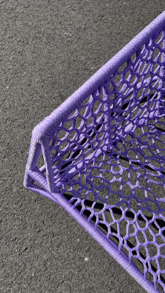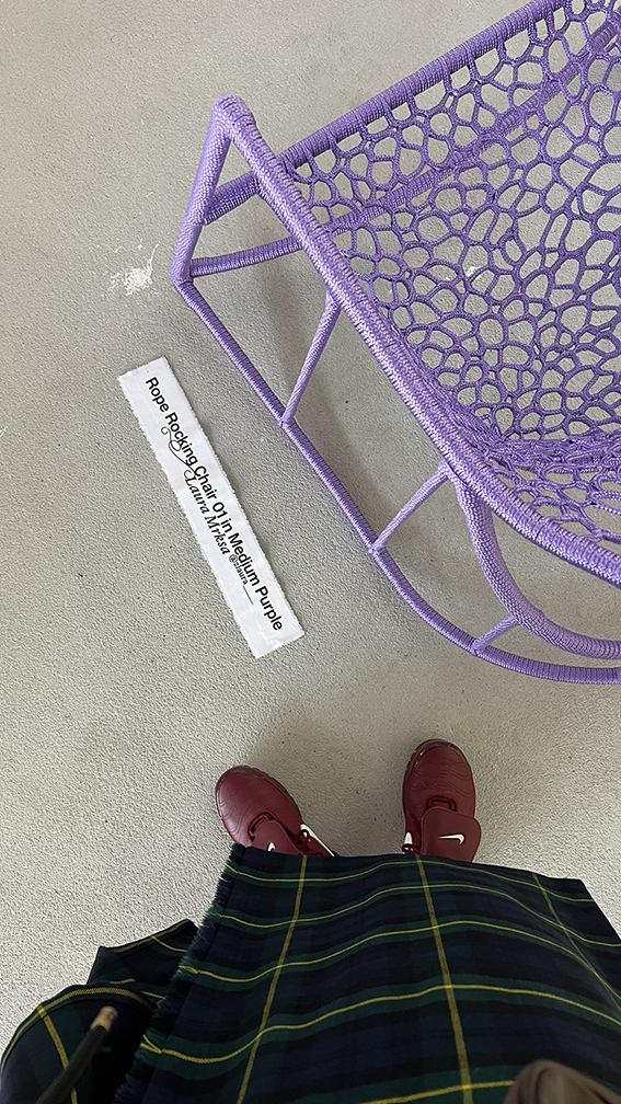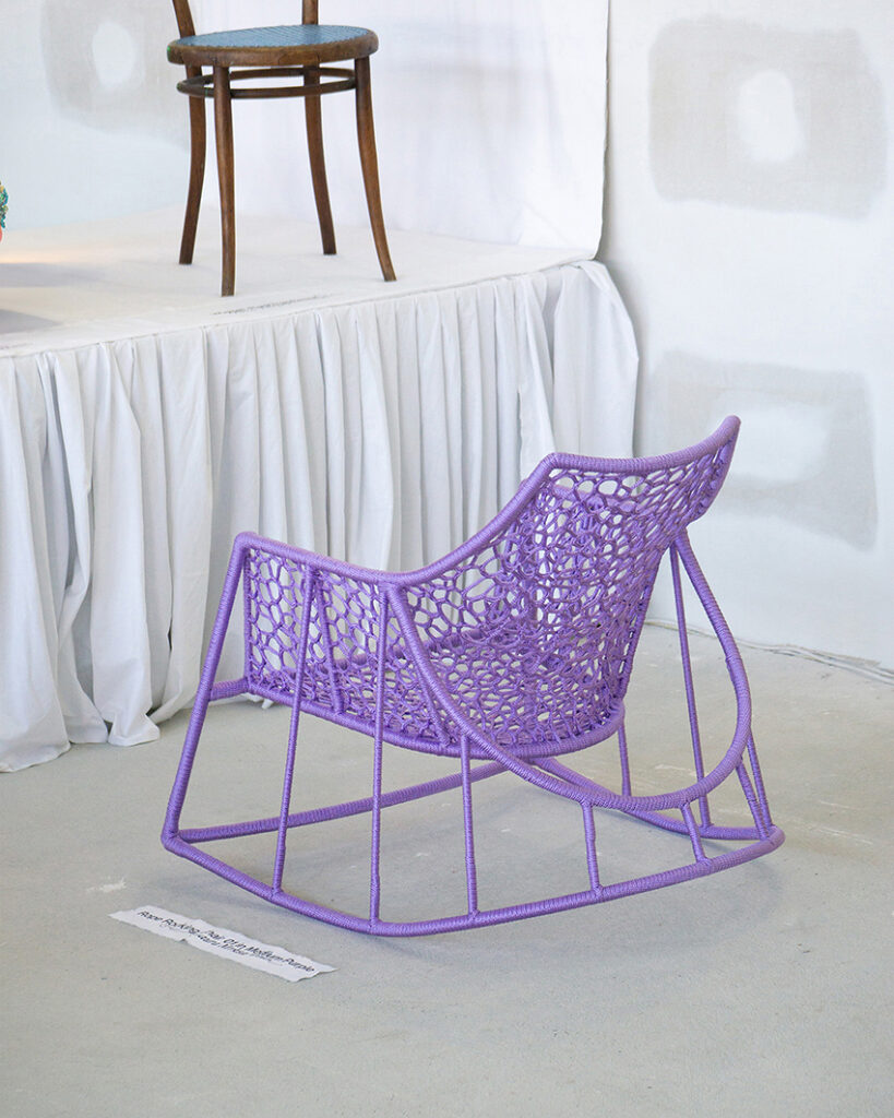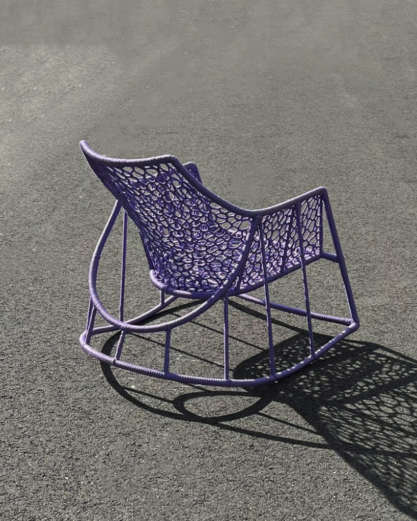 Rope Rocking Chair 01 in Medium Purple used to be a piece of trash that I was lucky enough to receive as a gift from my friends. After stripping it apart, I was left with a beautiful frame that I decided to weave using my signature rope-net weaving technique. Rope Rocking Chair 01 is a part of my ongoing Liftovers series, where I restore trashed furniture into a long-lasting treasures. I engage in a net-weaving technique that doesn’t use any predetermined patterns, making the process long and reflective.